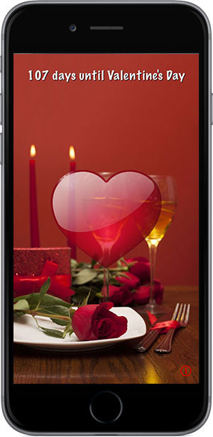 Valentine's Countdown ProDays until Valentine's Day on app's icon via push, music, animated heart that grows. Apple Watch App.